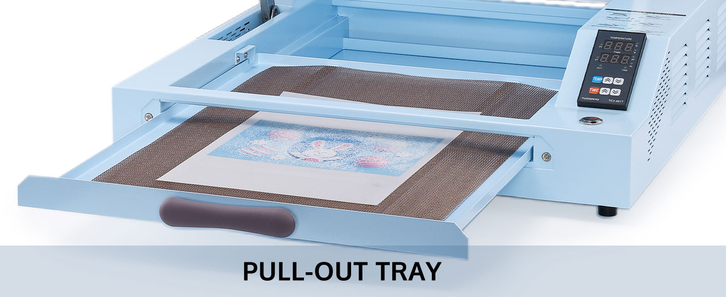 Equipped with four powerful, durable heating lamps, it ensures thorough 3D heating and even heat distribution, eliminating uneven spots for consistently optimal curing. The concave-convex drawer tray and a mesh Teflon pad support DTF film in heated air, promoting uniform heating for flawless transfer results.