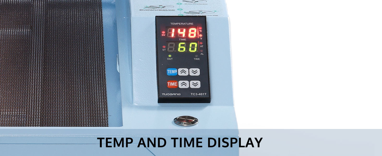 - 【Fast & Efficient】DTF Curing Oven start with 130°C(266℉) for 90 seconds and check the curing. If not fully cured, gradually increase the temperature. Success is when the white background of the film .becomes visible.Maximum temperature:356℉/180℃,time: 0-999s.